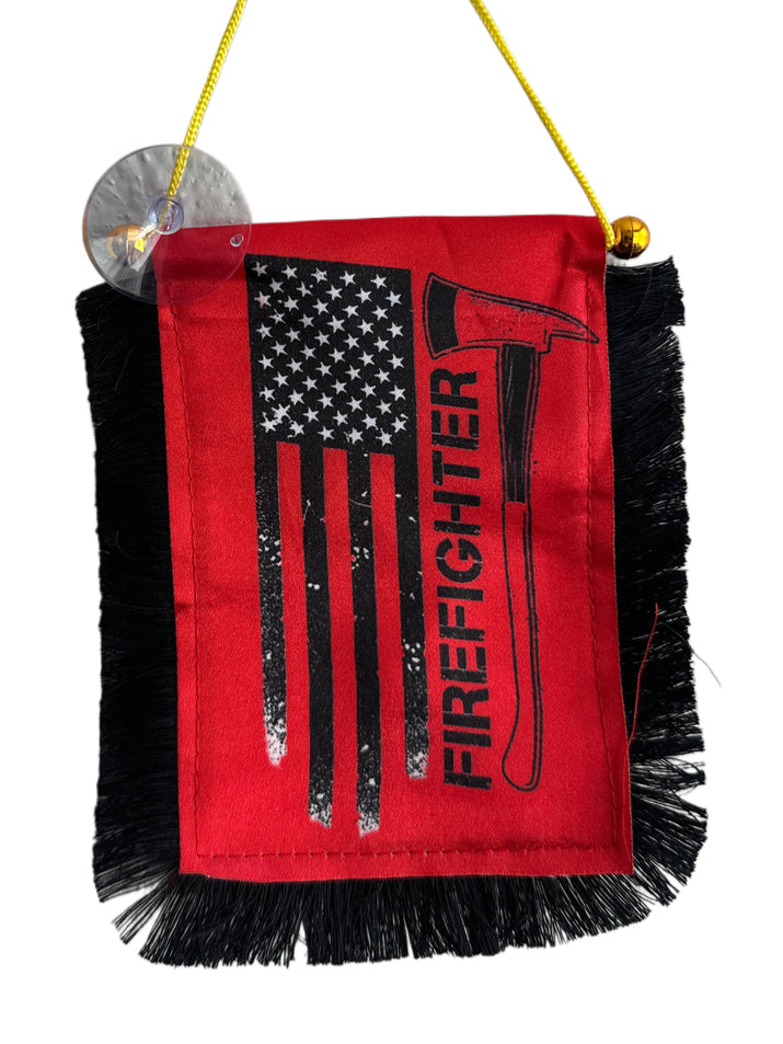 Firefighter Hanging Banner - 4x6 Fringy Window Hanging Flag - Mini Flag Banner & Car Rearview Mirror Decor - Fringed & Double Sided - Hanging Flag with Suction Cup