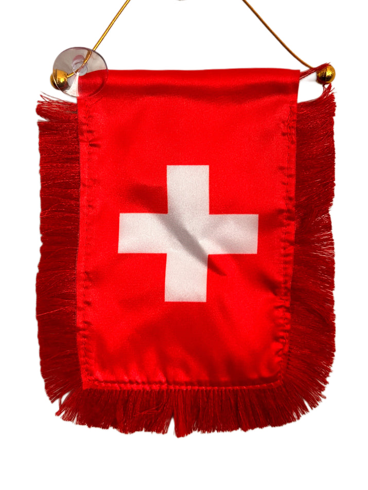 Switzerland Flag Banner - 4x6 Fringy Window Hanging Flag - Mini Flag Banner & Car Rearview Mirror Decor - Fringed & Double Sided - Hanging Flag with Suction Cup